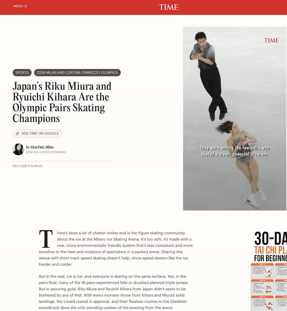 “The Japanese pair completed a stunning comeback to capture the country’s first Olympic gold in pairs figure skating, inspiring the broader figure skating community.”